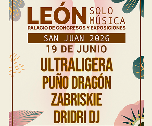 León Solo Música San Juan 2026Viernes 19 de junioPalacio de Congresos y ExposicionesULTRALIGERAPUÑO DRAGÓNZABRISKIEDRIDI DJApertura puertas: 19:00h / Conciertos: 19:30h